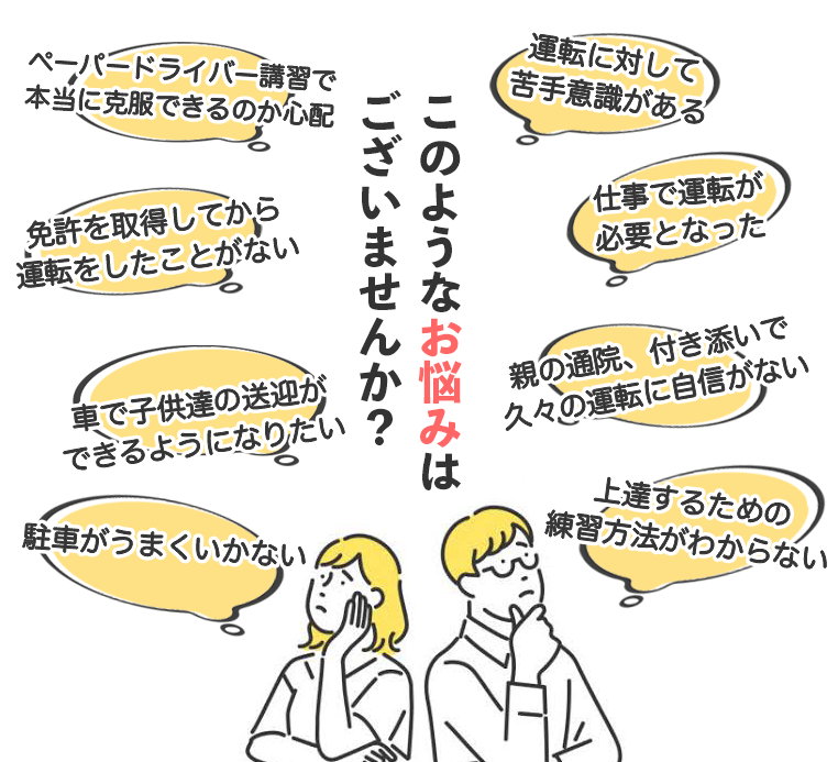 だからこそ、いろんなお悩みをご相談いただきます。出張型ドライビングスクール ドライブアップは、そういった様々なイメージをお持ちのお客様ひとりひとりに寄り添い、最適な練習内容をご提案、苦手克服へのお手伝いをさせていただいております。